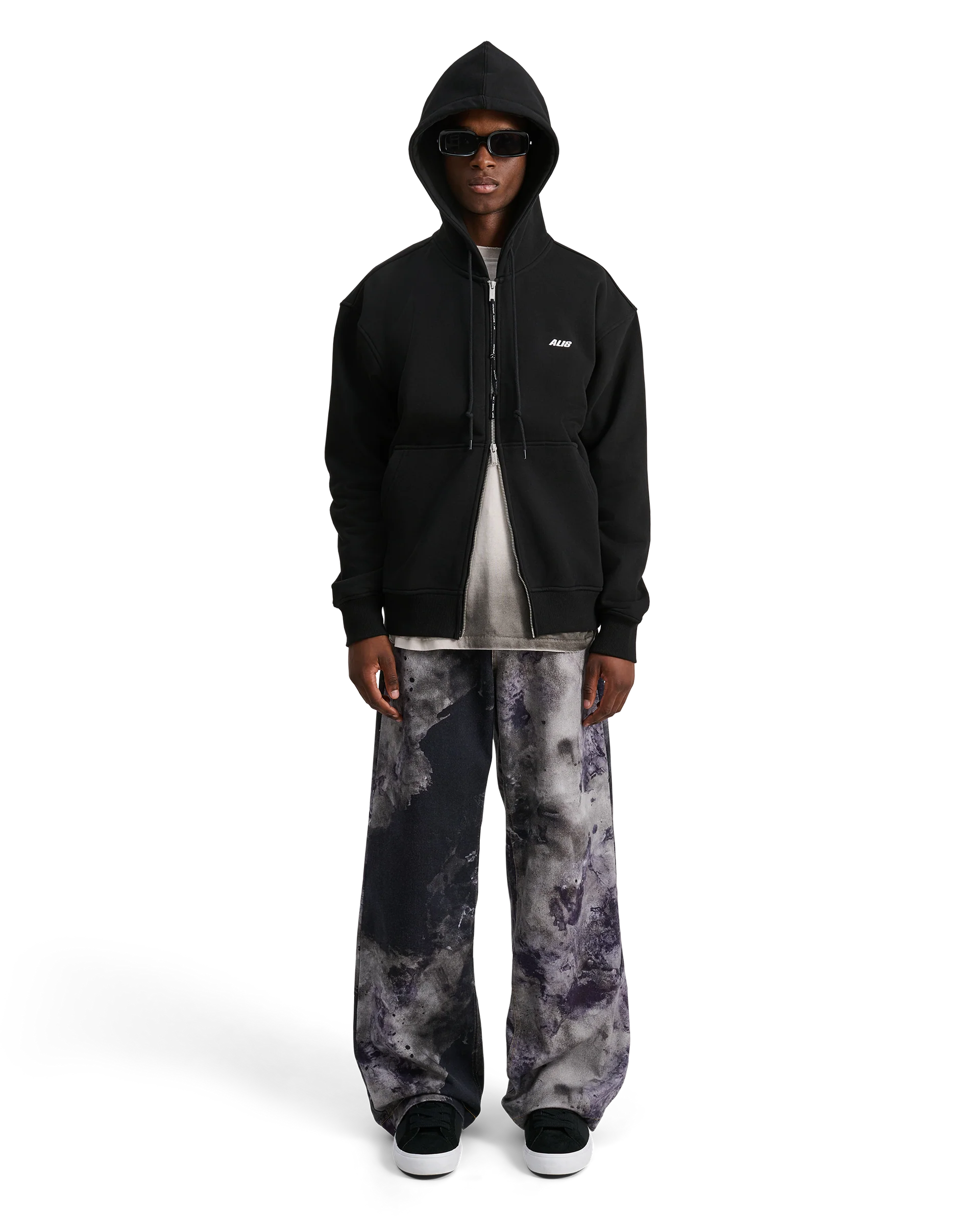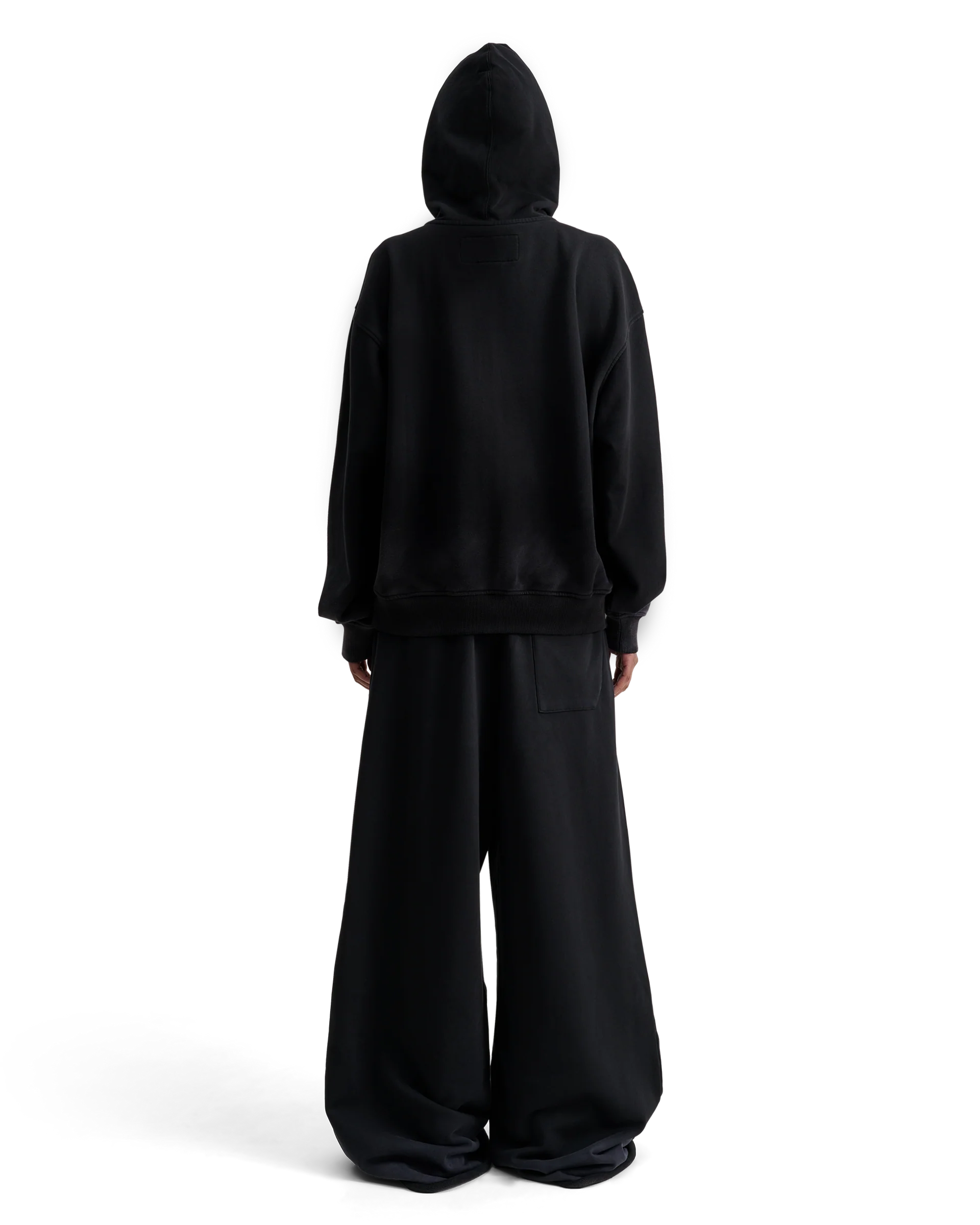 Aaron er en let oversized zip-hoodie i sort, fremstillet af kraftig jerseybomuld for en eksklusiv og slidstærk kvalitet. Hoodien er blød, forvasket og farvet som færdigt stykke (piece dyed), hvilket giver et rigt og holdbart udtryk.