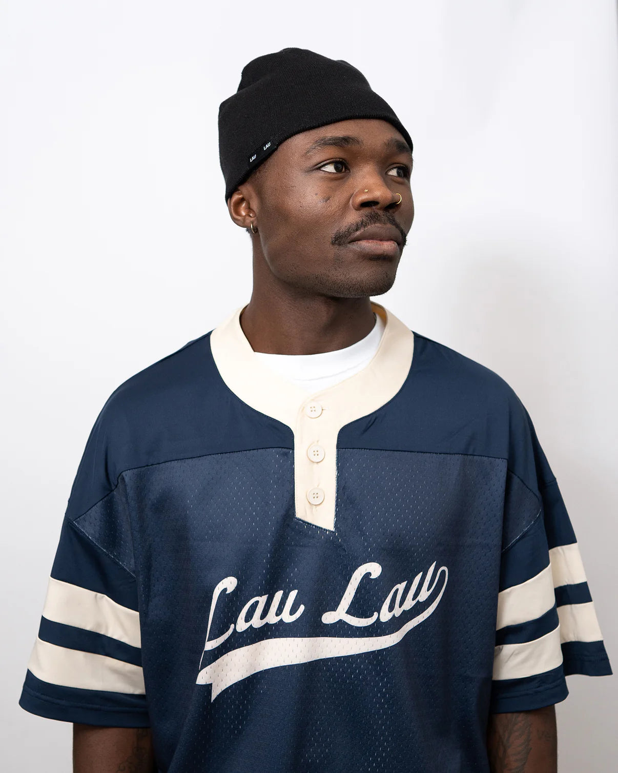 Lau Lau Efterår/Vinter 2025 "Jersey" er en navyblå trøje med offwhite detaljer.