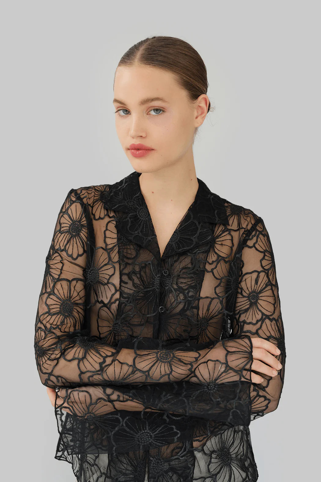Flora Shirt i sort er en smuk, blomsterblonde-top fremstillet i 100 % genanvendt polyester. Skjorten er designet med knapper langs midten og en klassisk krave med V-halsudskæring. Flora Shirt udstråler elegance og kan både styles over en top eller kjole, eller bæres med mindre underneath for et mere dristigt look.