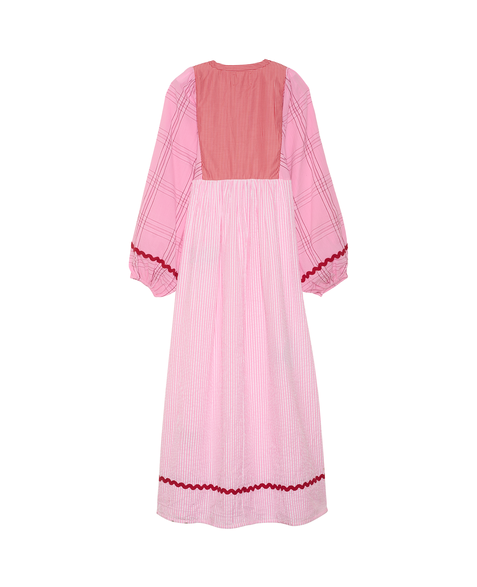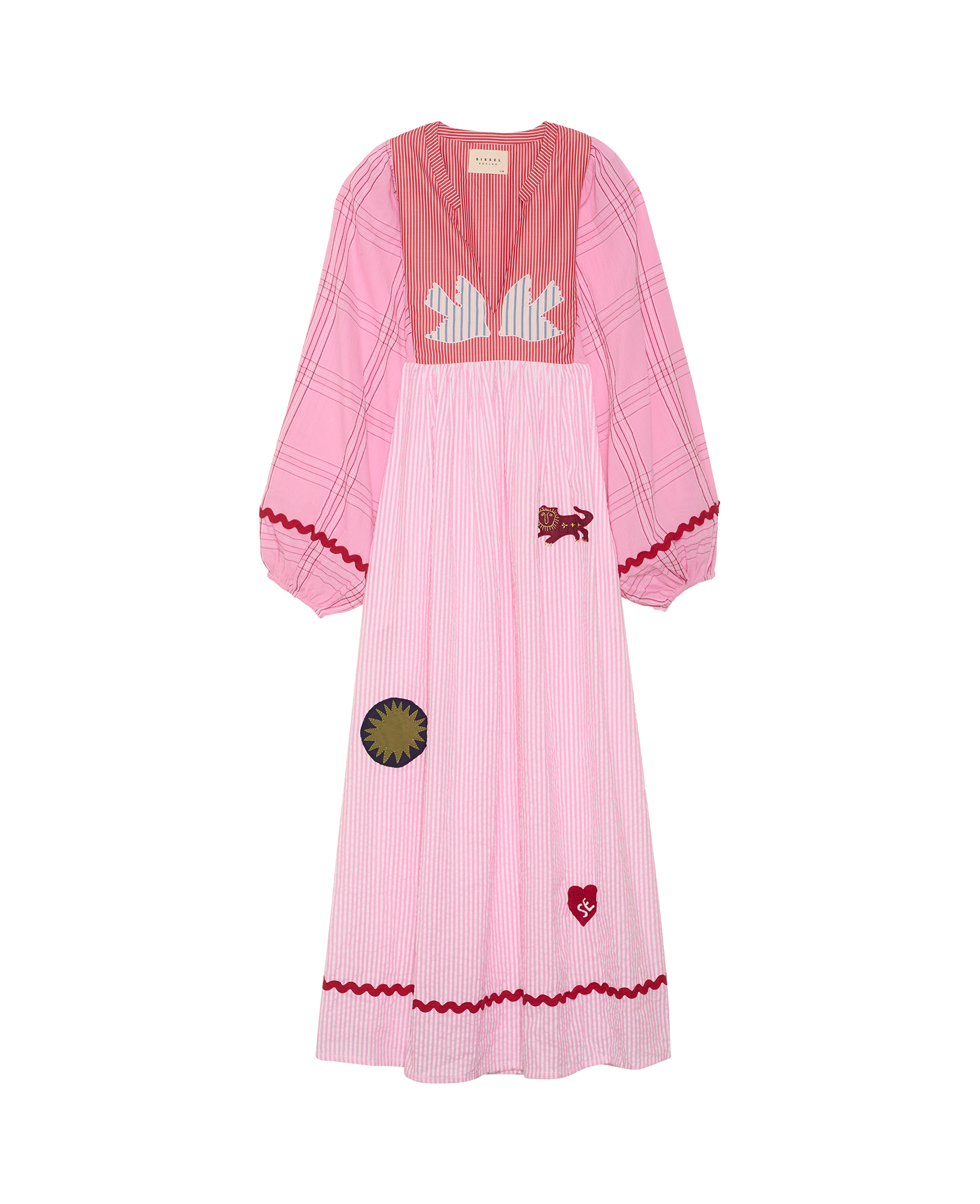 Gaia-kjolen har en rummelig pasform og er fremstillet i en smuk kombination af overskydende, garnfarvet bomuld. Kjolen har en skæring med rynker lige under brystet, som fremhæver en feminin silhuet. De brede ballonærmer har elastik i ærmeåbningerne, hvilket giver et blødt og voluminøst udtryk. Halsudskæringen er rund med en smal krave og en slids foran, afsluttet med bindebånd. Kjolen er dekoreret med fine motiver skabt af påsyede rester af stof, ensfarvet bomuld og delikat broderi, mens en markant rød zigzag-bort tilfører et dekorativt element på ærmerne.