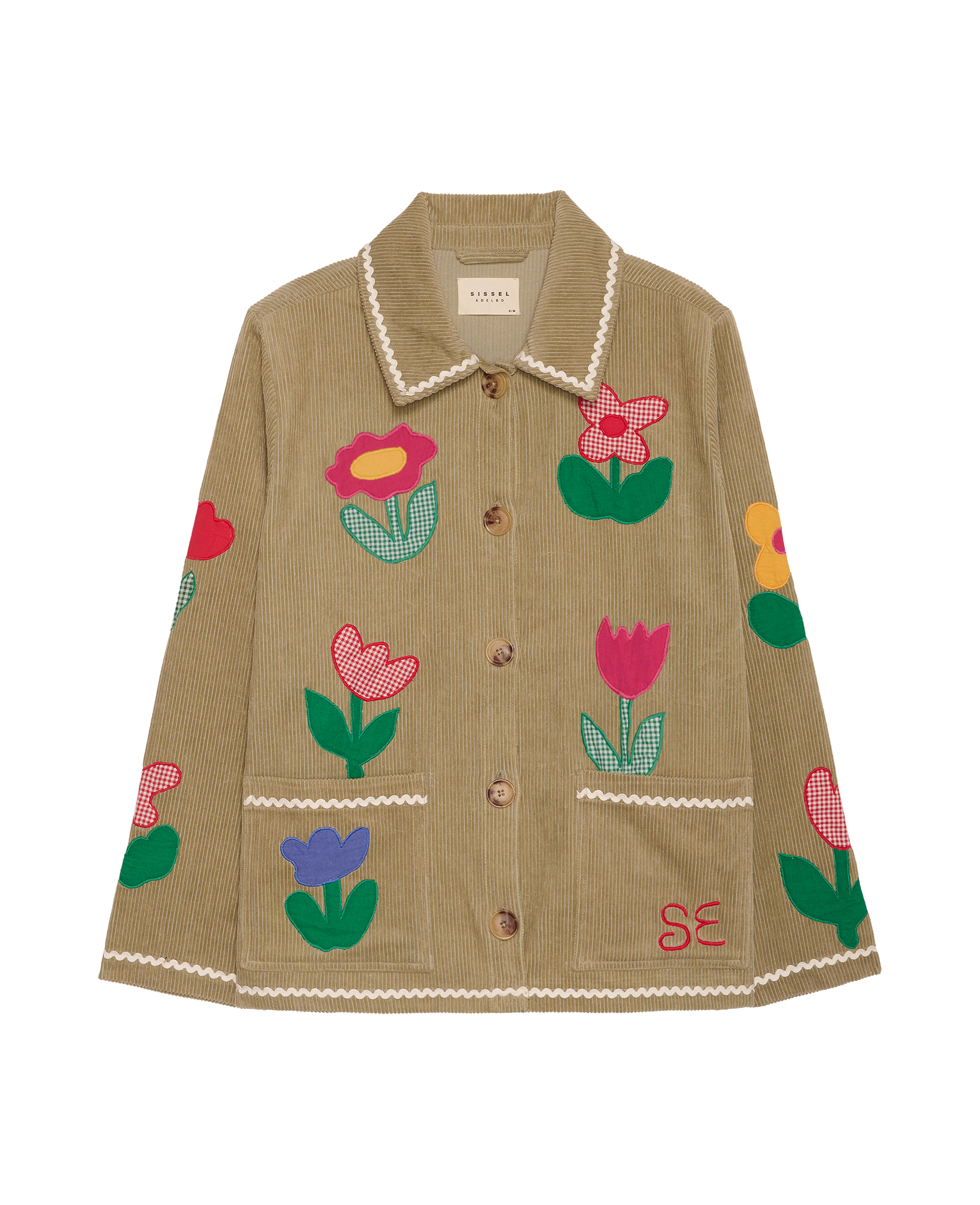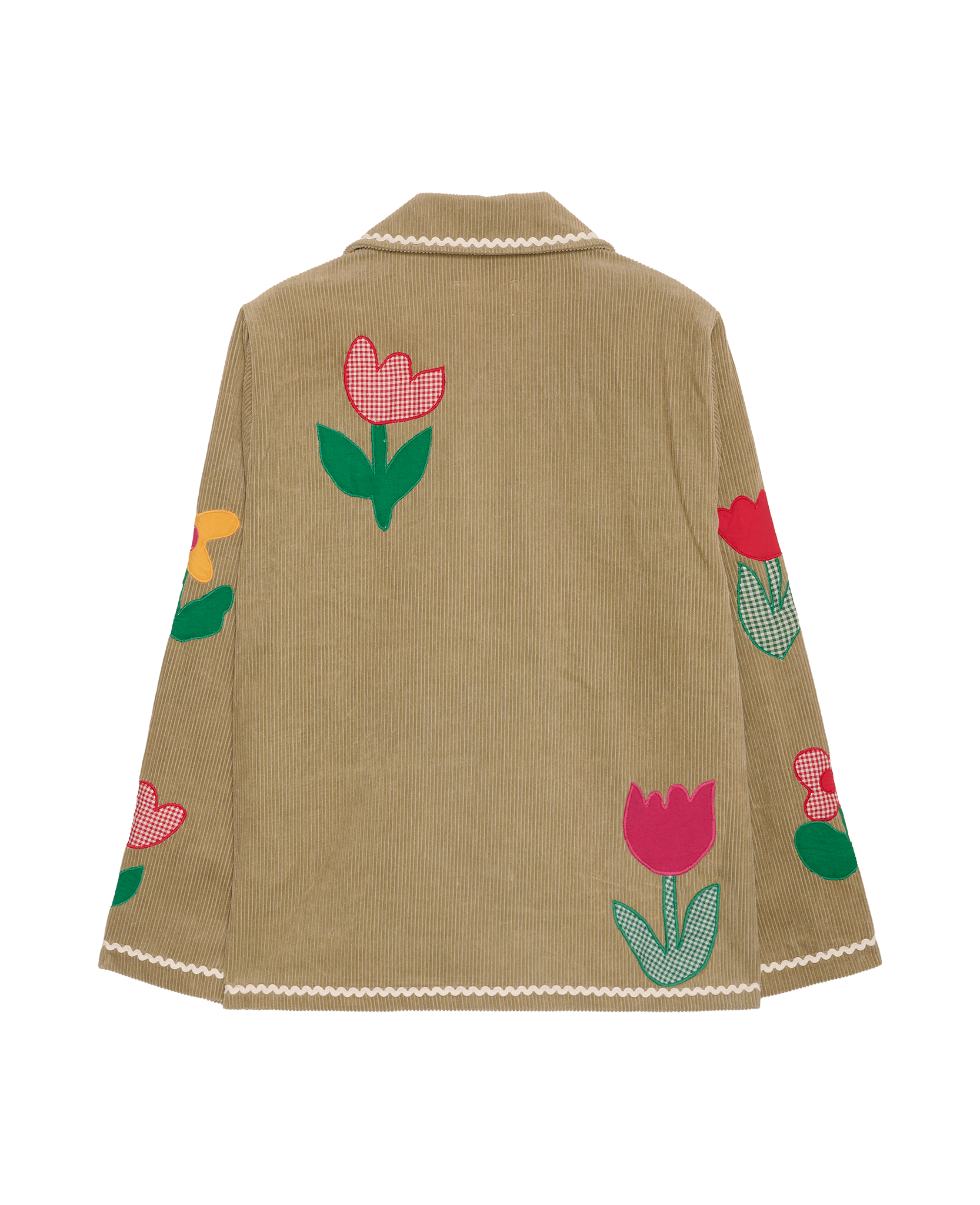Twiggy-jakken er fremstillet i overskydende fløjlsbomuld og har en afslappet silhuet med lille skjortekrave og lange ærmer. Den lukkes foran med knapper og har to lommer placeret nederst på fronten. Jakken er smukt dekoreret med påsyede tulipanblomster, udført i en kombination af overskydende, garnfarvede tern og ensfarvet bomuldsstof, og afsluttet med zigzag-bånd i en kontrasterende farve.
