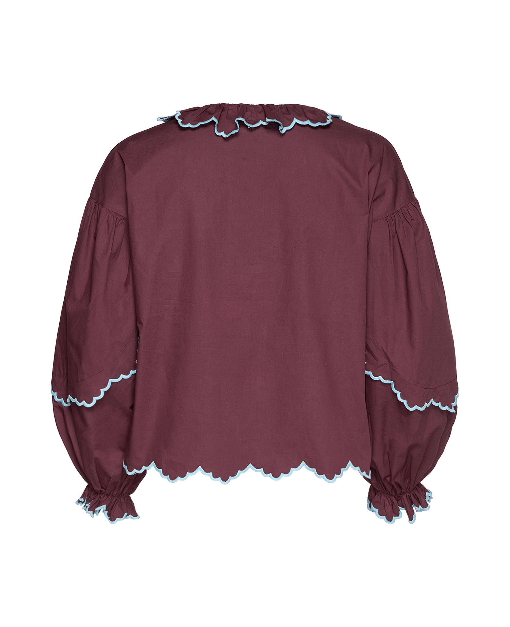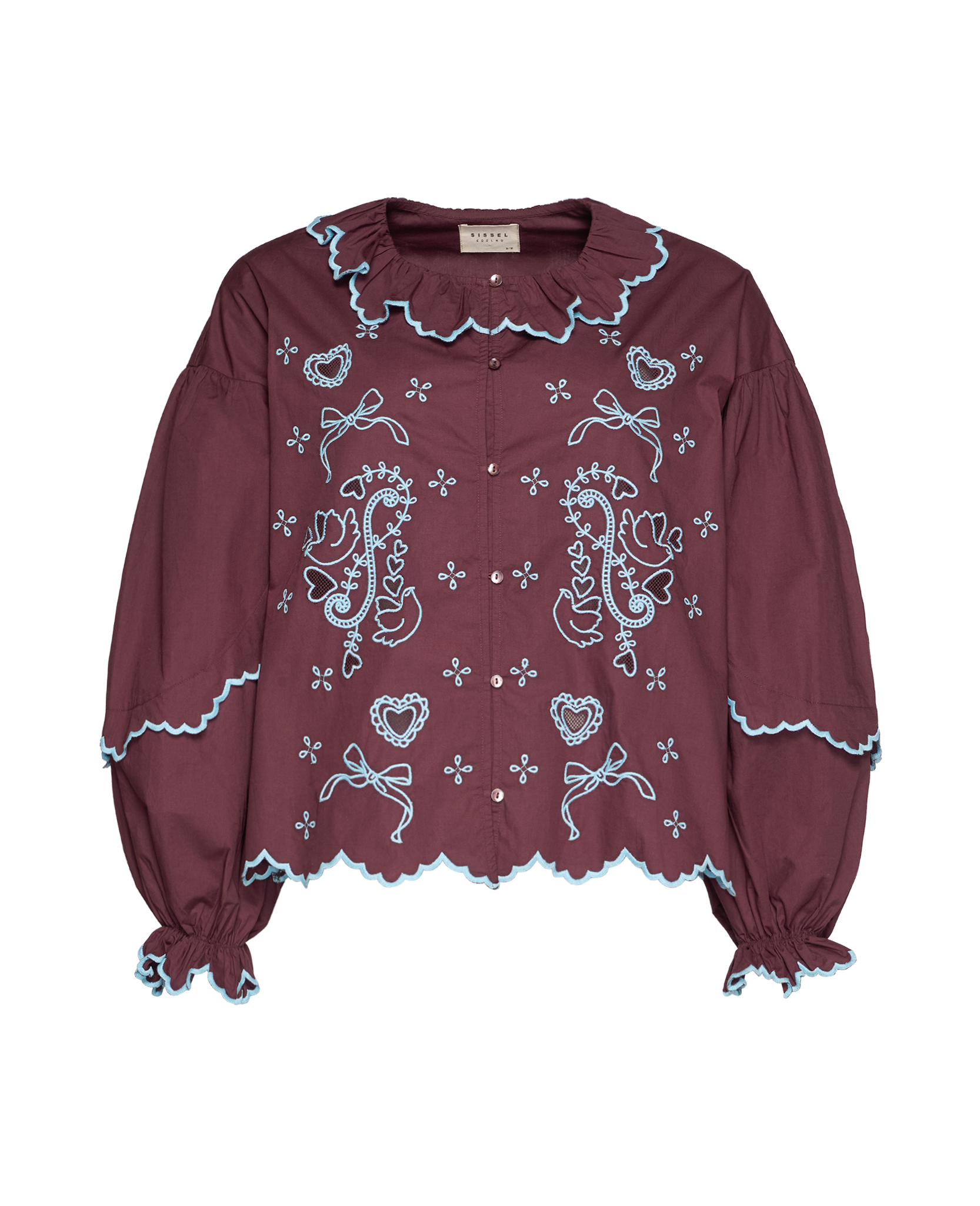 Designet er smukt dekoreret med poetiske udskæringer og broderier, der forestiller motiver som fugle, hjerter og sløjfer. Skjortens kanter har bølgede broderede afslutninger i en kontrastfarve, der tilføjer et ekstra feminint touch.
