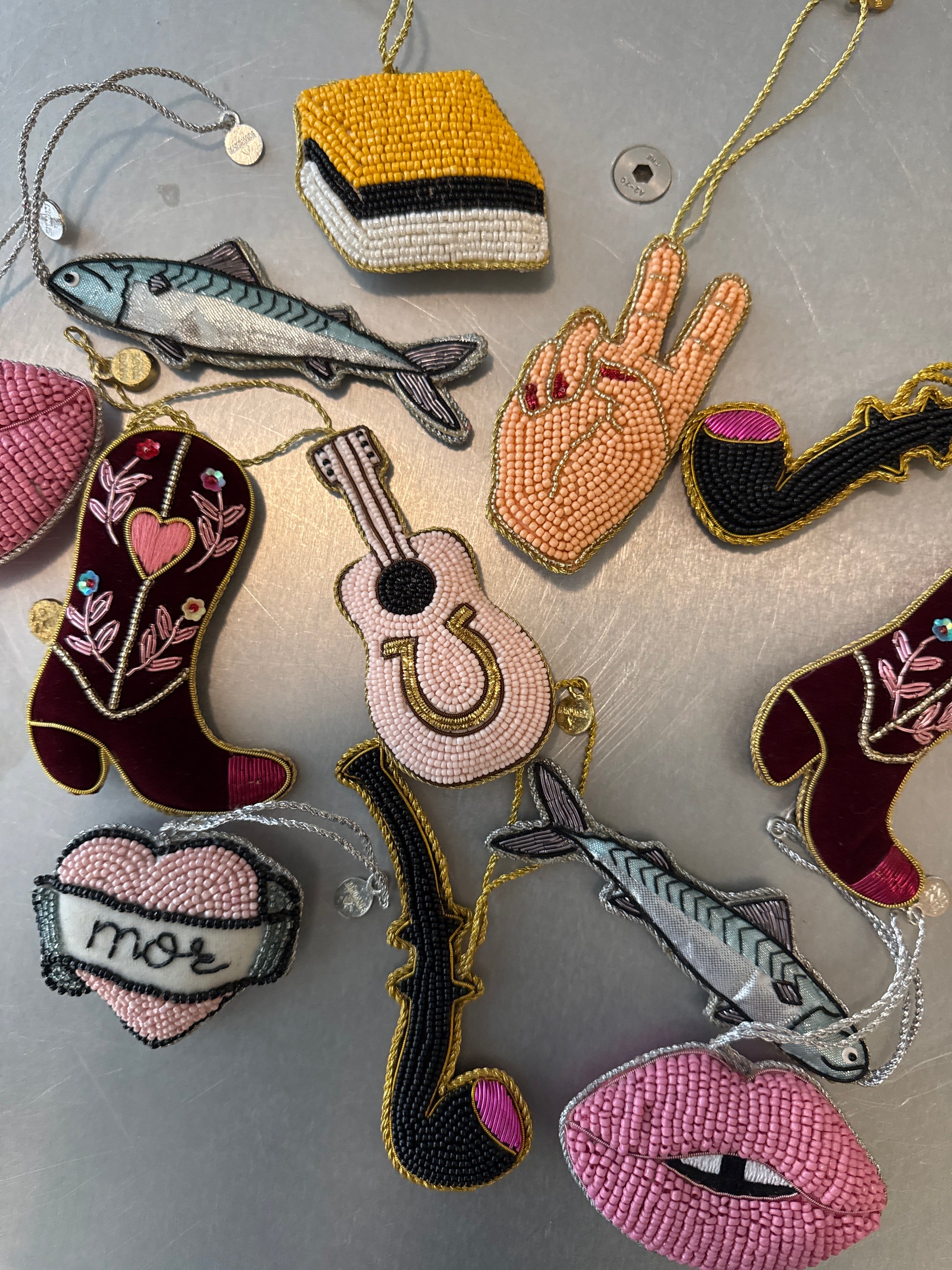 Håndbroderet guitar i håndfarvede perler og metallic tråd.